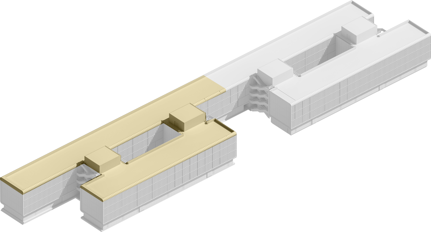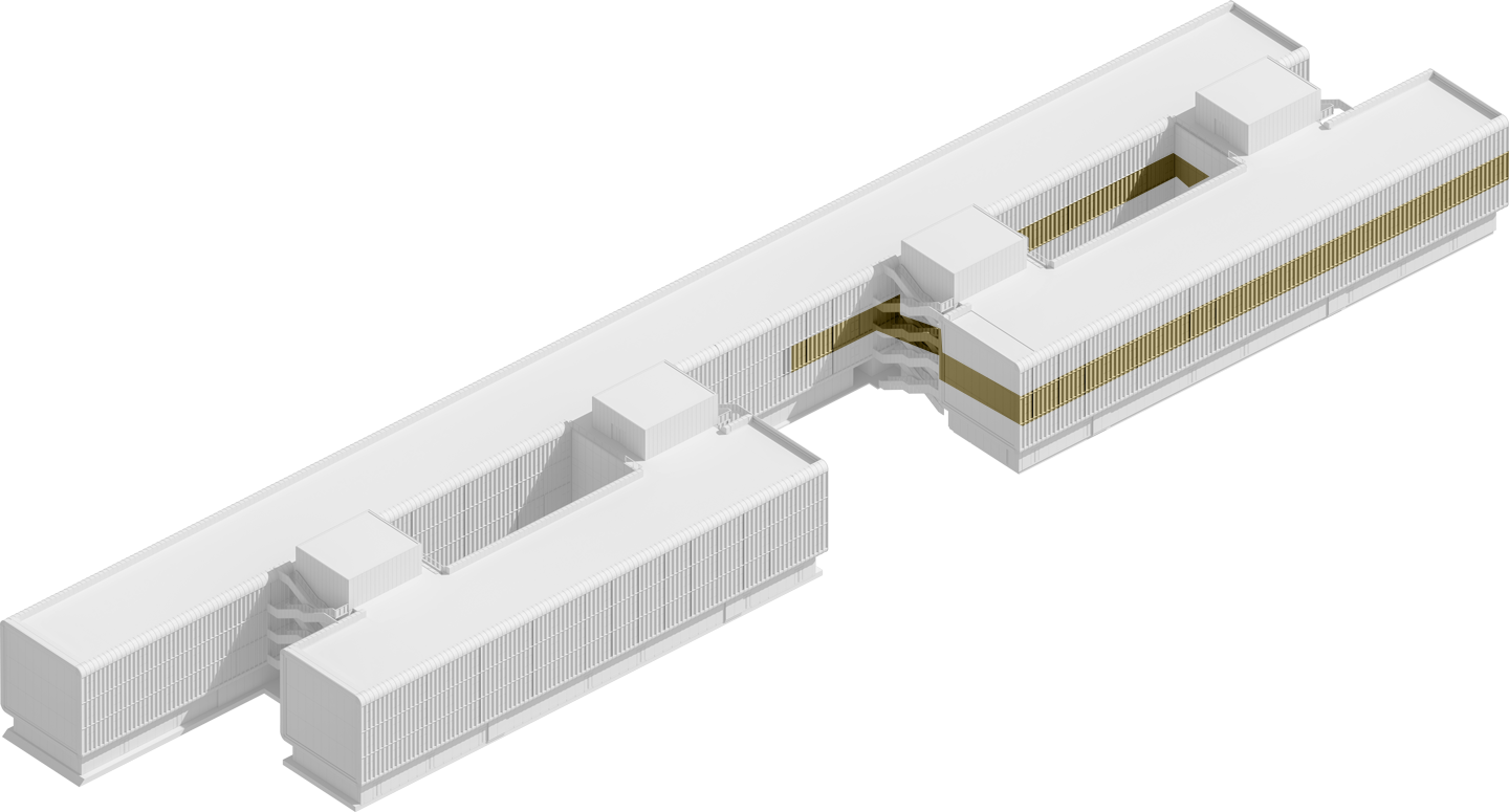Slender vertical elements inspired by aeronautical engineering articulate the façades, generating vibrations through a play of rhythm and depth, while glazed end sections to the east and west open views toward the Idroscalo and surrounding landscape. Four volumes suspended between the two main structures recall both cargo containers and boarding bridges of terminals, reinforcing the connection between architecture and movement.